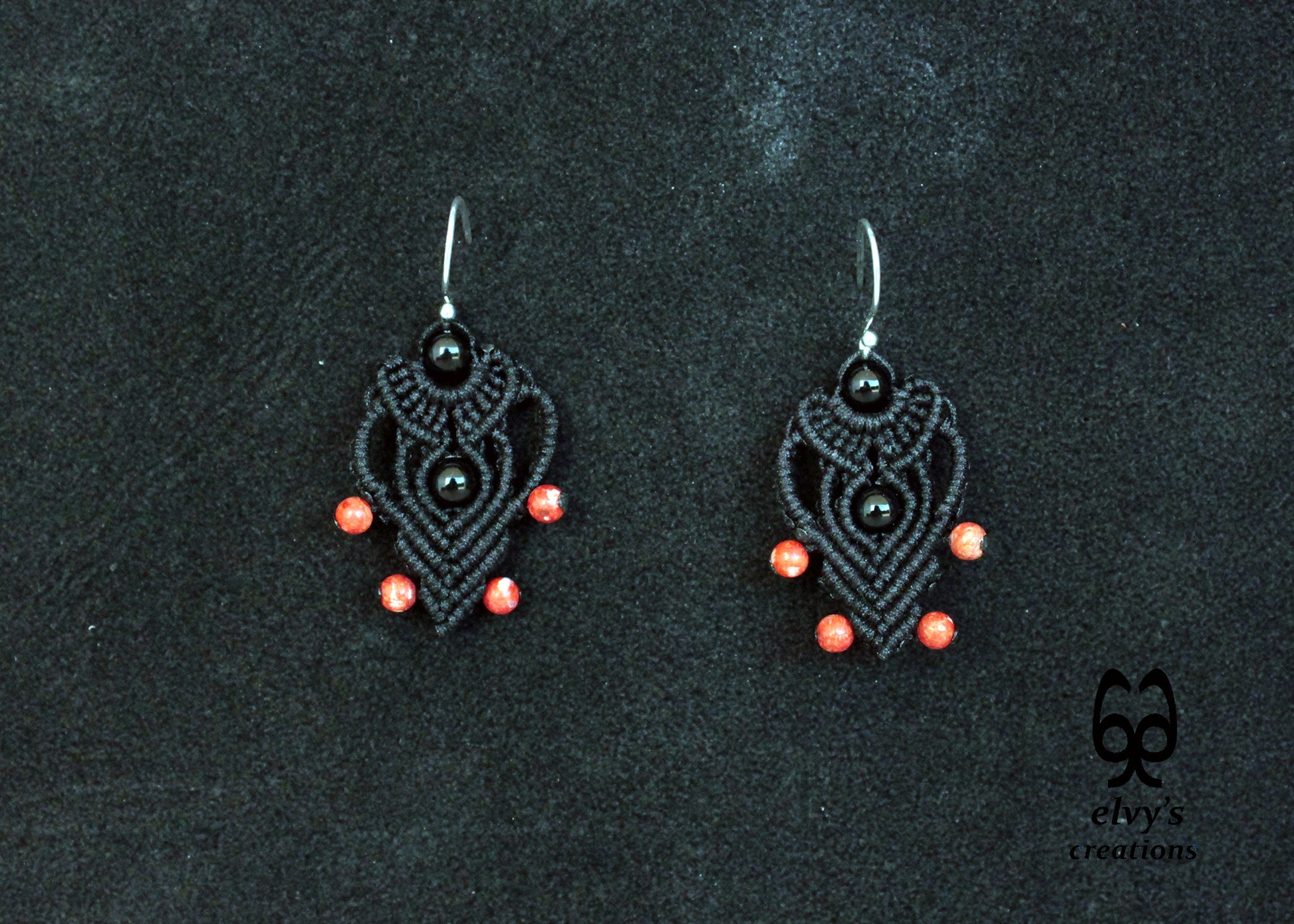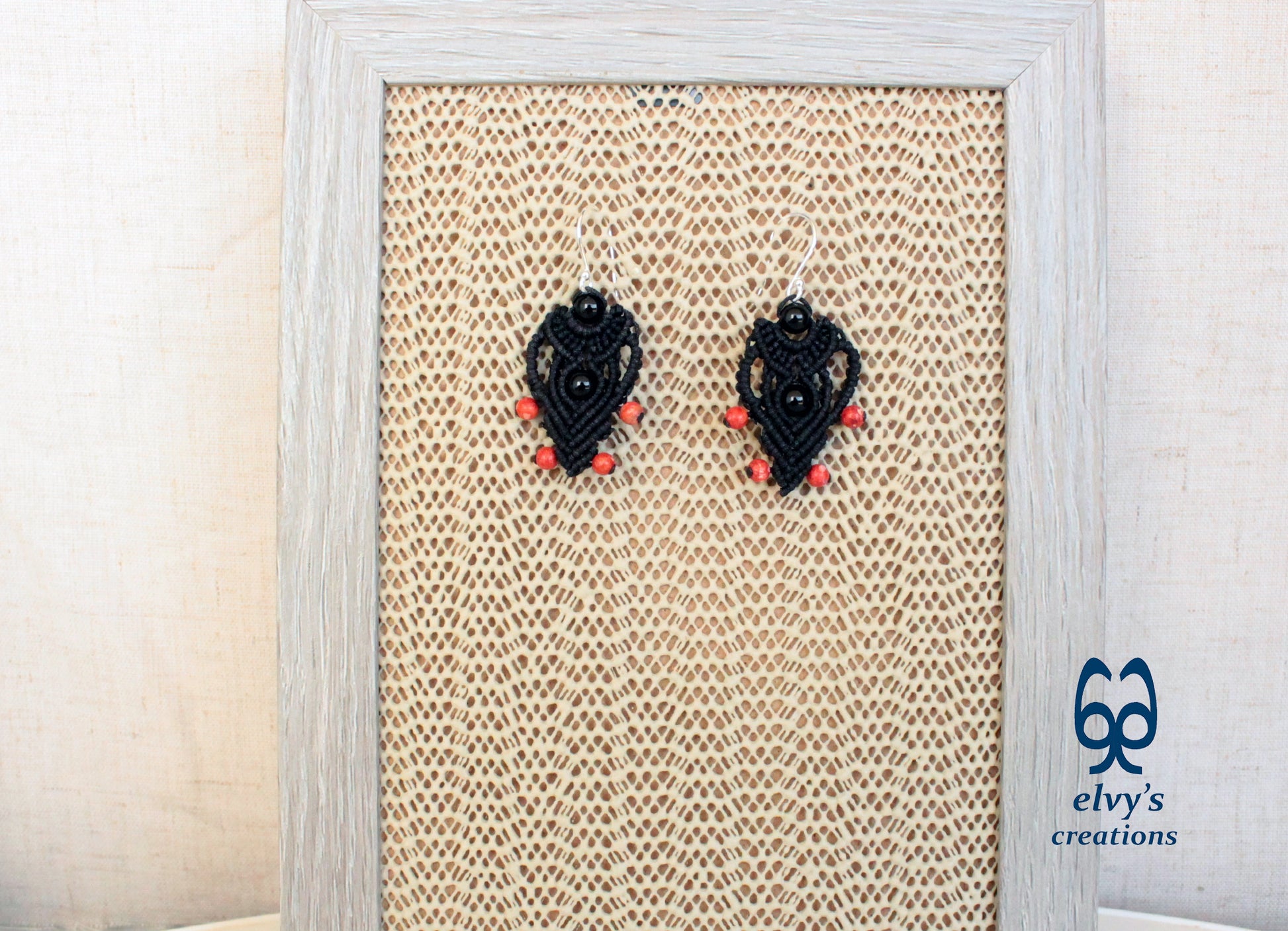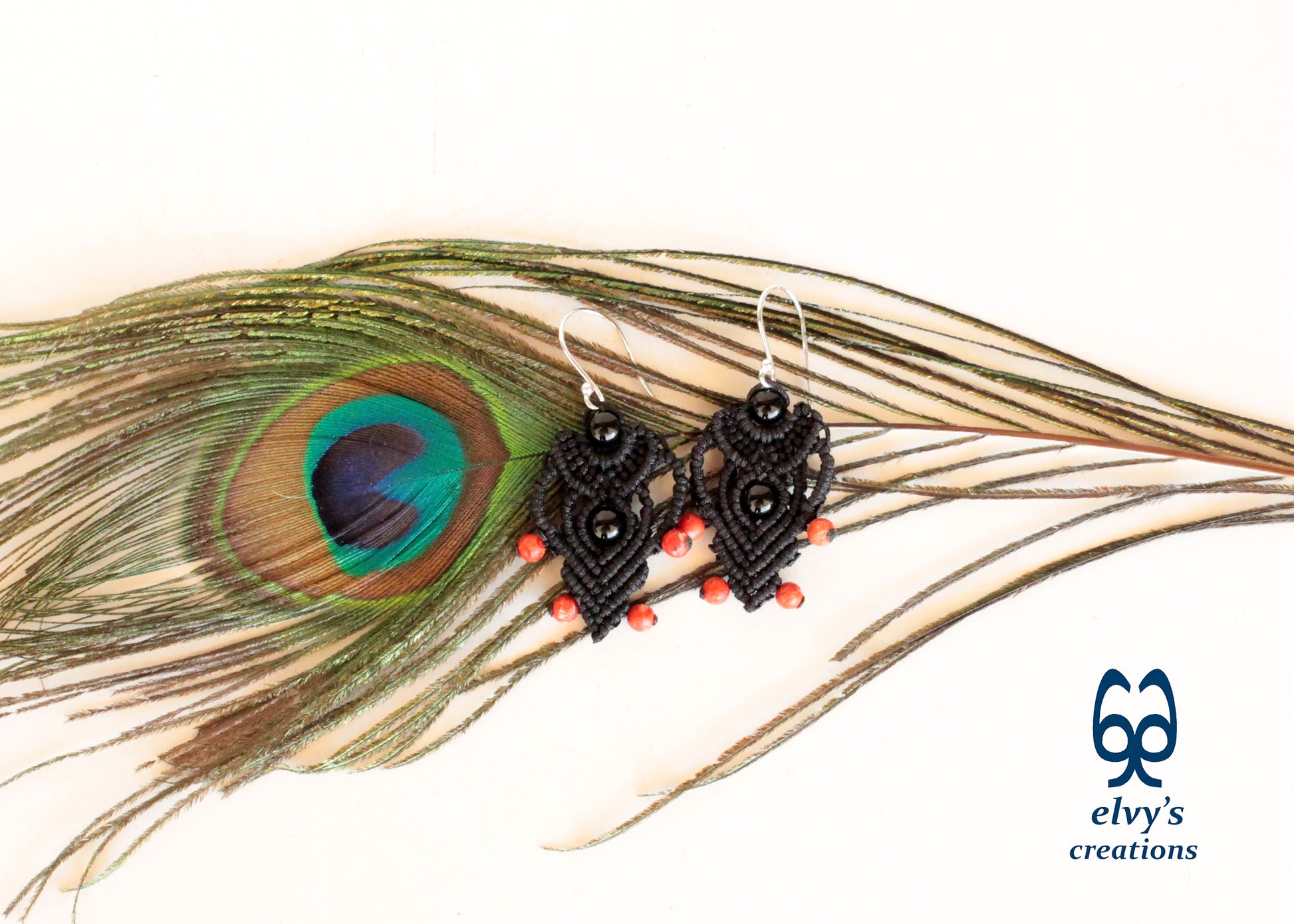 Each earring holds 2 Onyx gemstone and 3 beautiful red Coral gemstone. The earrings are handmade by me with macrame black.