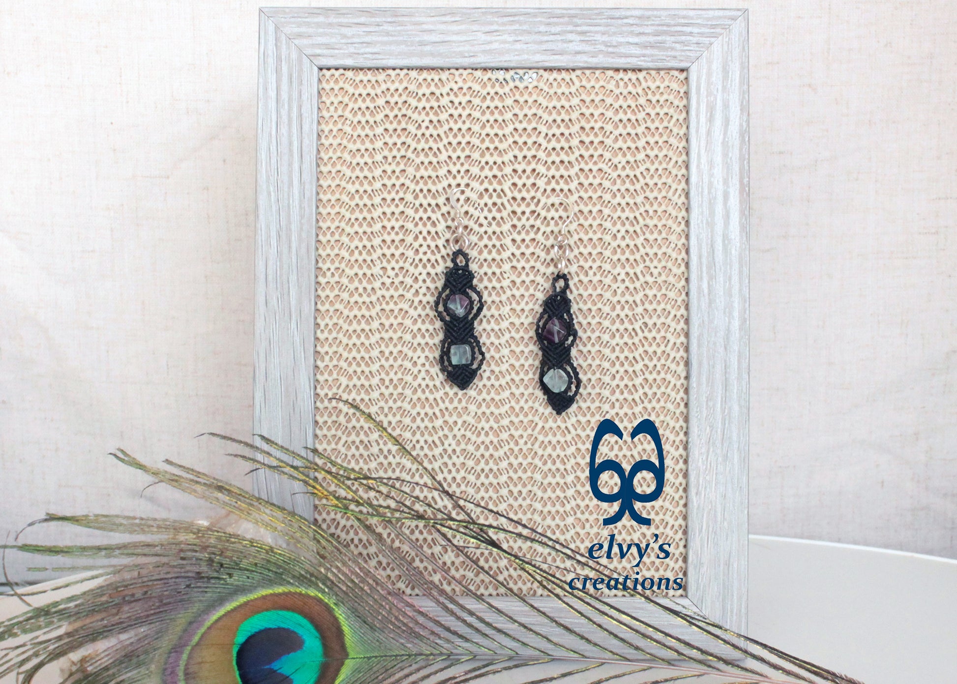 The earrings are handmade by me with the technique of micro macrame, with premium Dandelion macrame black cord. This macrame pair of earrings holds 2 dazzling fluorite cubes per earring, one green and one purple! The earring hooks, as well as the details of the earring are 925 Sterling Silver.