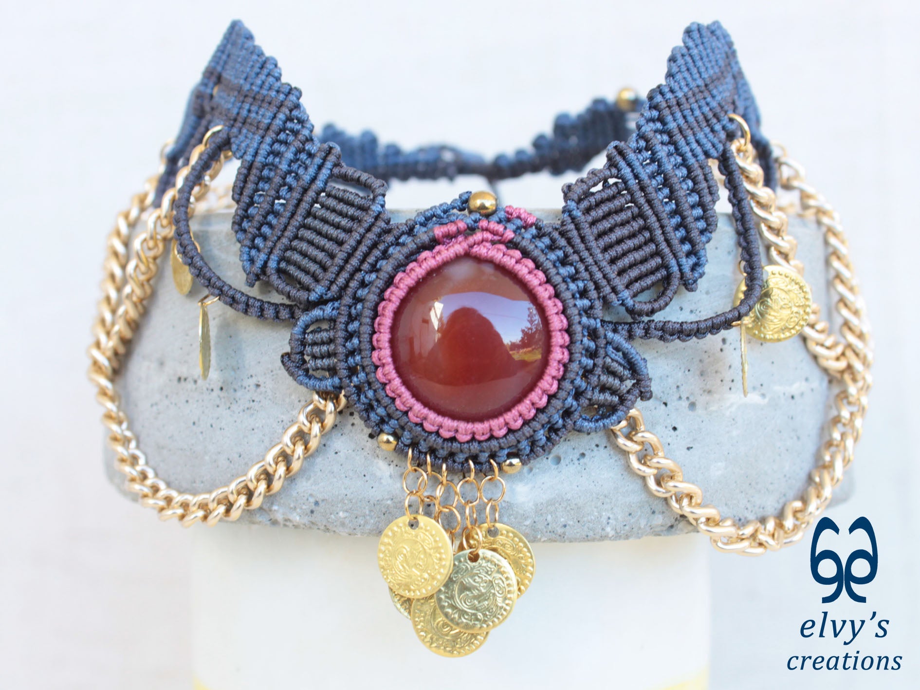 This is a macramé beaded choker necklace handmade in Greece with blue, gray and pink macrame cords. Orange Carnelian gemstones, as well as coins and stainless steel gold chains are decorating the necklace.